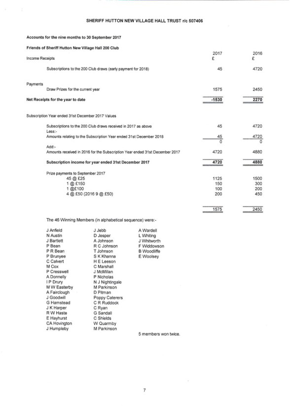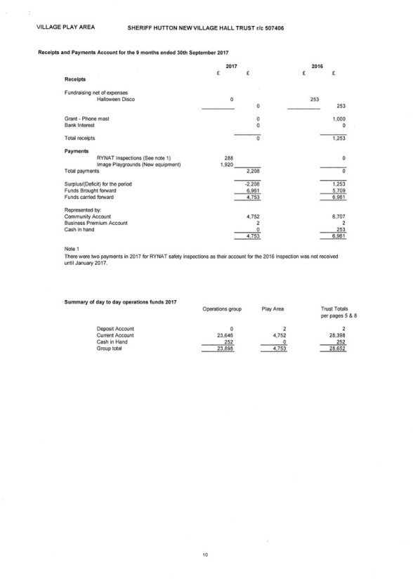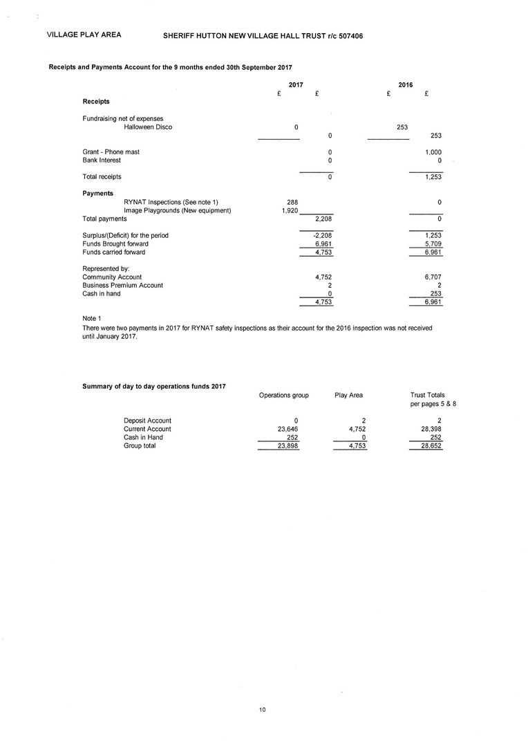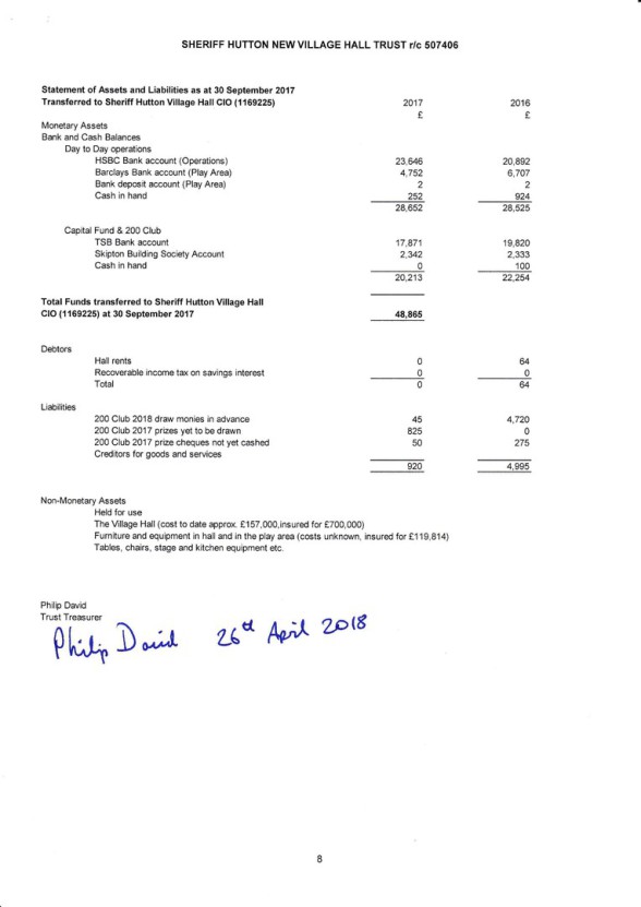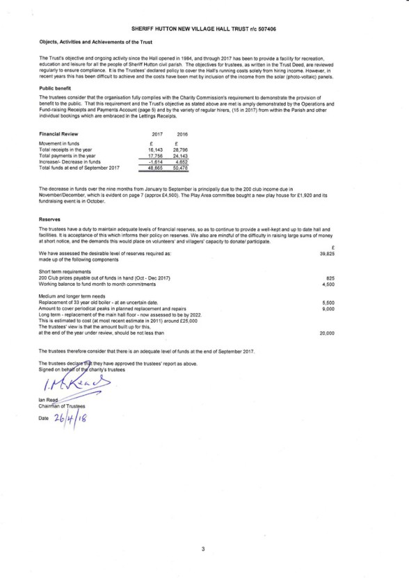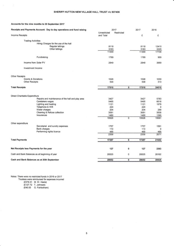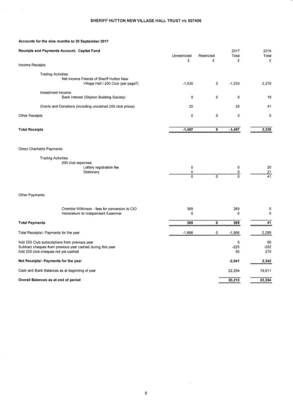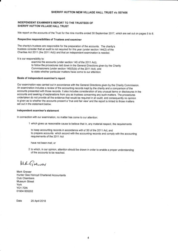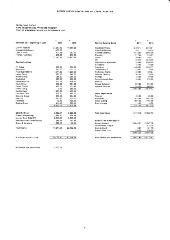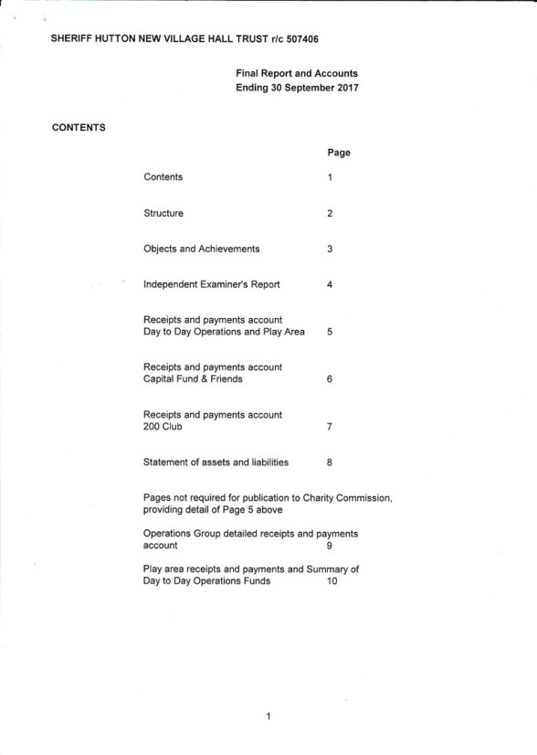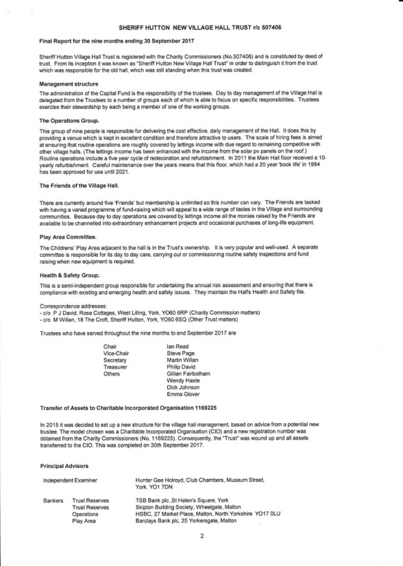 See below for the Final Accounts for Registered Charity 507406 ("Sheriff Hutton New Village Hall Trust").