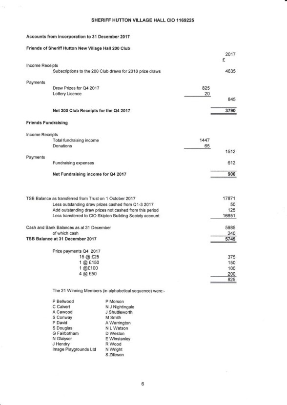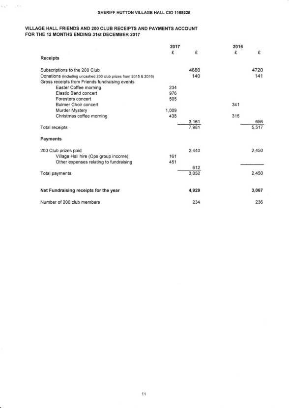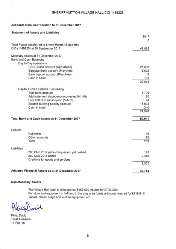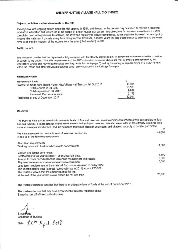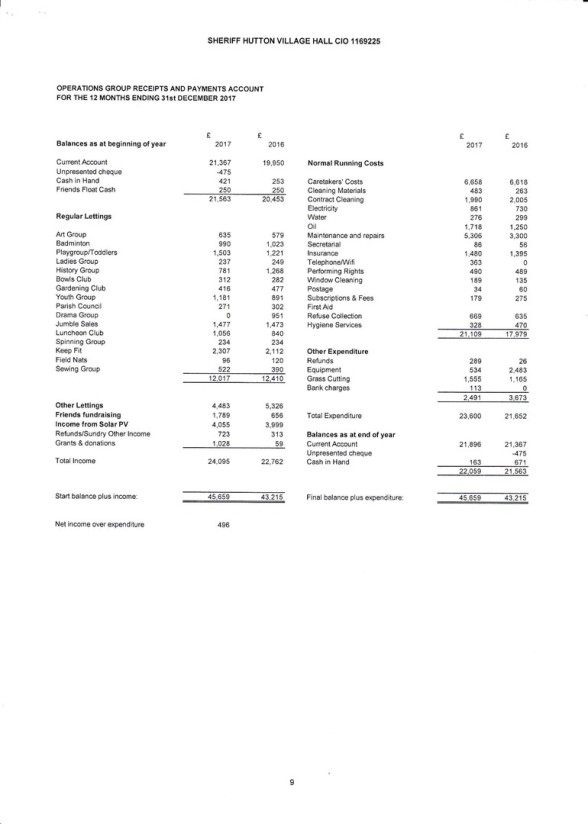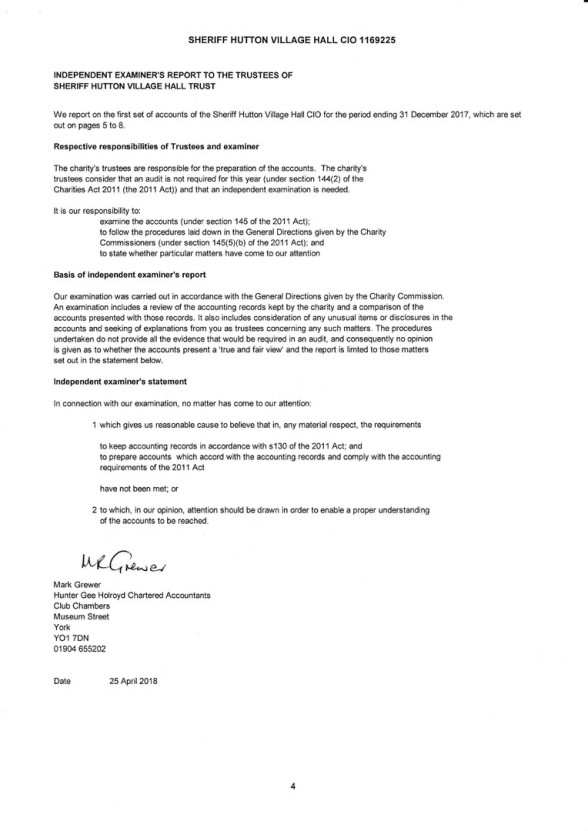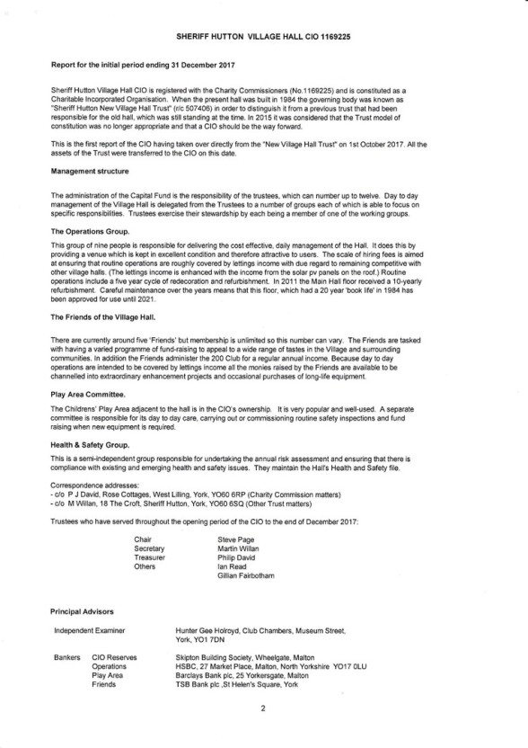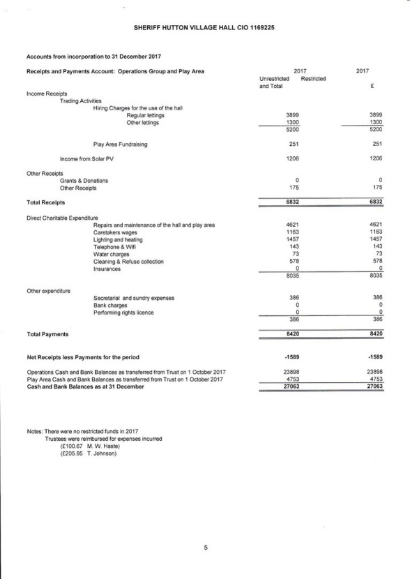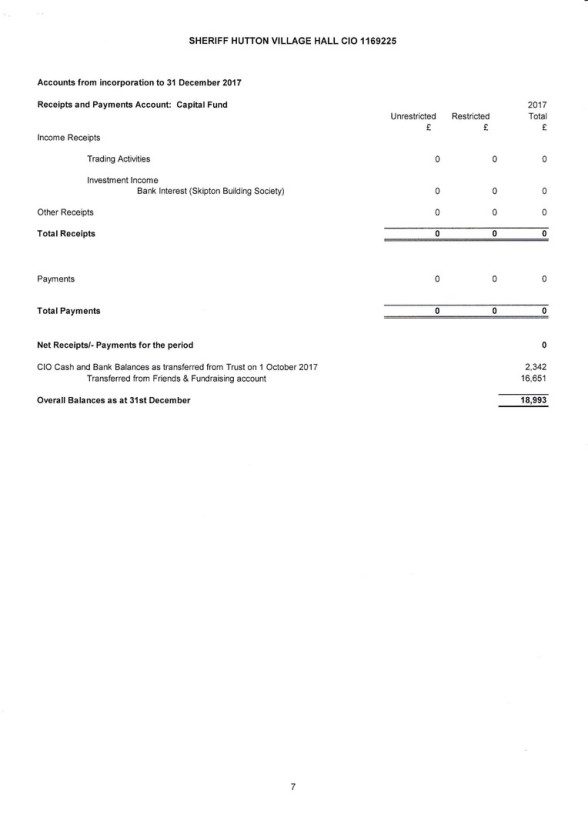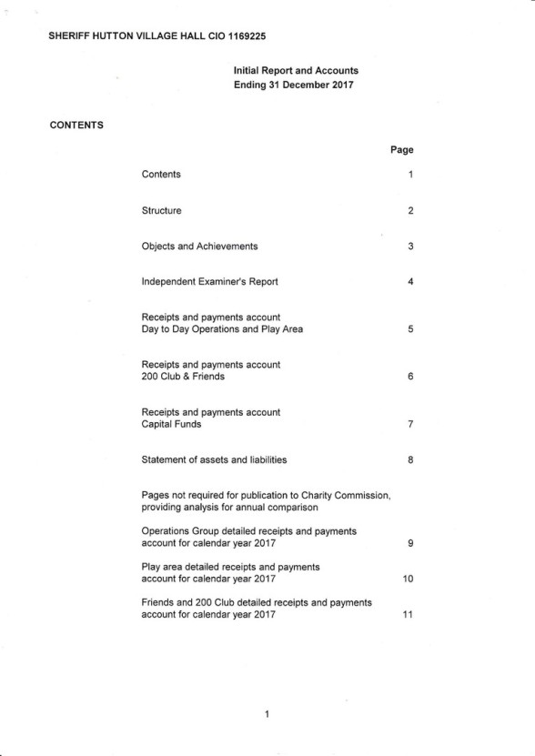 The Initial Accounts (2017) for Charitable Incorporated Organisation 1169225 ("Sheriff Hutton Village Hall") are shown below.
