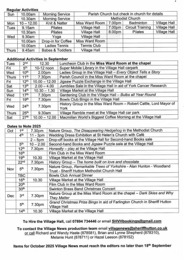Please note that the History Group talk on 24th September will be in Sheriff Hutton Village Hall and not in the Miss Ward Room of the Methodist Church as shown in the list below.
